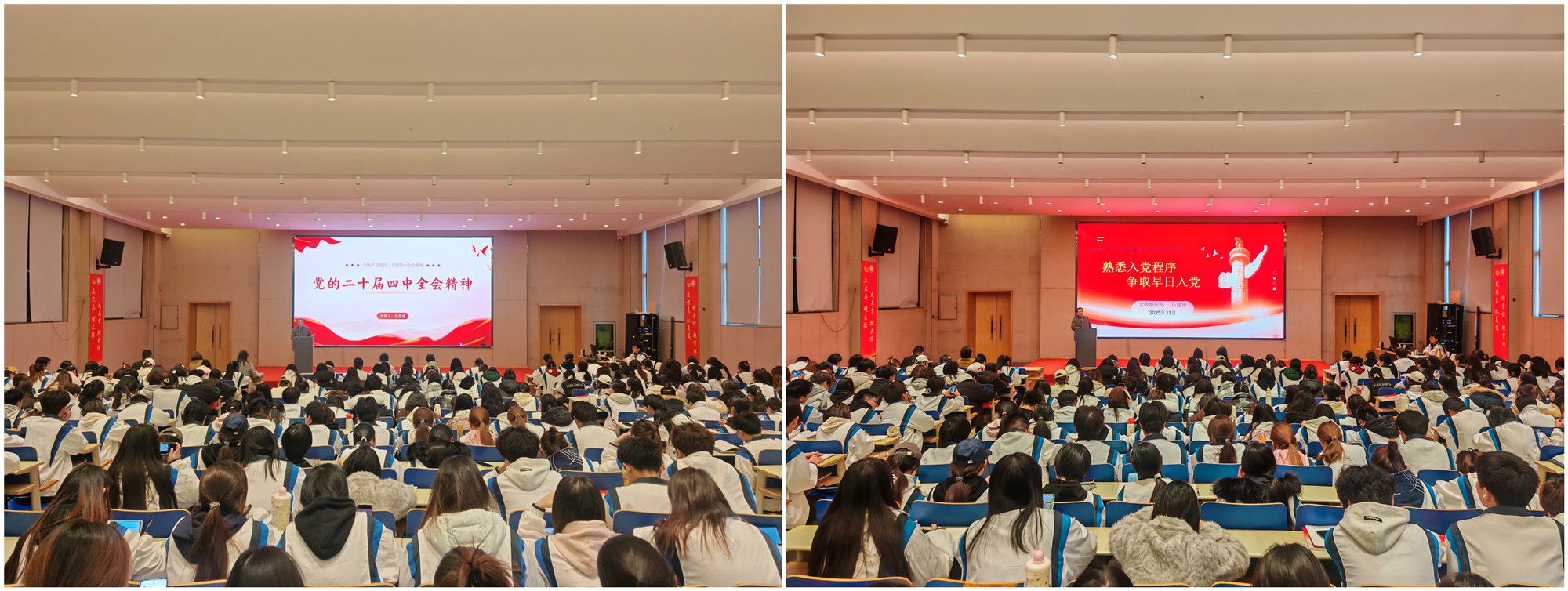 党委组织部部长伍建成作了党的二十届四中全会精神宣讲,重点讲解了党的二十届四中全会会议概况、重大意义、关于教育科技人才方面的精神,以及学习贯彻会议精神的要求。并以“熟悉入党程序,争取早日入党”为题,全面讲解了入党流程及注意事项。勉励同学们要掌握扎实的科学文化知识,全面提高自己的综合素质,做到德智体美劳全面发展;要时刻以党员的标准来要求自己,积极主动为学校和广大师生服务;要始终保持思想上和行动上的先进性,既要密切联系同学,关心同学,又要有强烈的责任感和奉献精神。