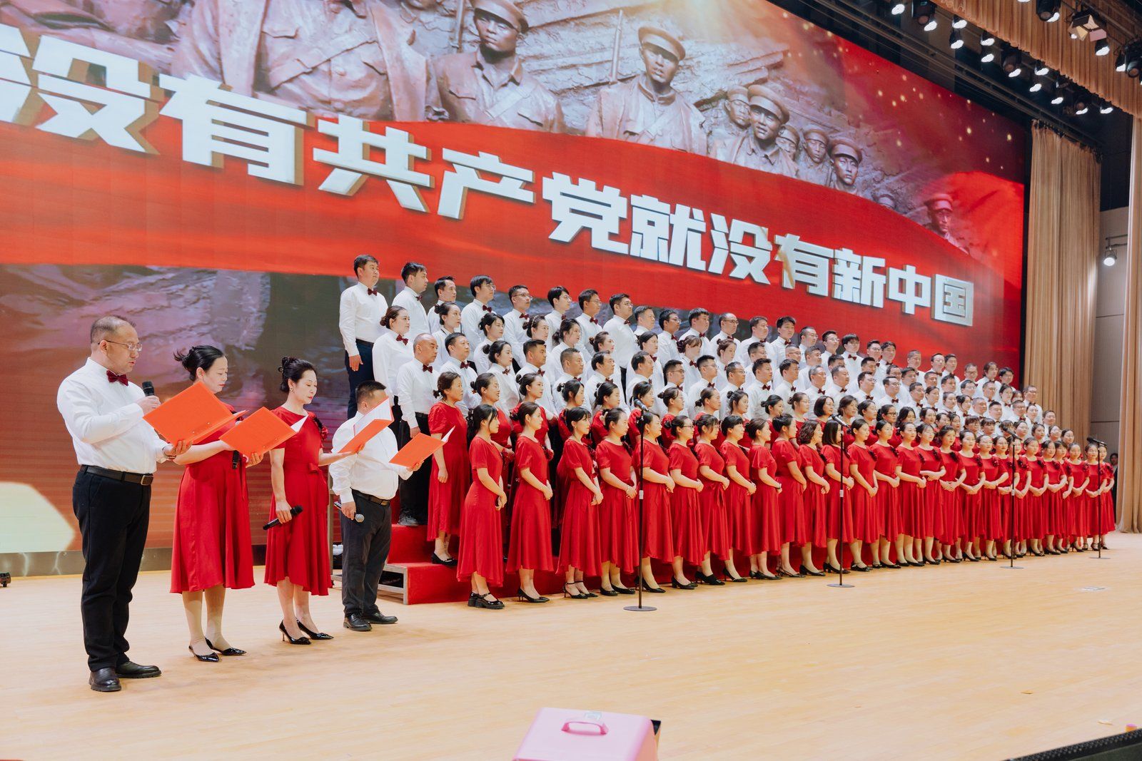 陕服教师合唱团合唱《歌唱祖国》《没有共产党就没有新中国》在深情旋律中拉开晚会序幕。老师们精神饱满、歌声嘹亮,用真挚的情感致敬祖国、致敬时代,彰显家国情怀与责任担当。