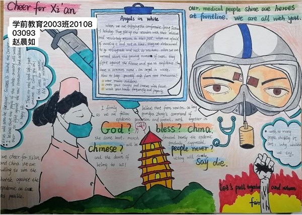 英语老师给学生起到了垂范作用,学生在宿舍里也认真学习和练习,没有因为疫情而影响学习。对老师布置的课后作业,自主学习之外,能和舍友一起讨论,作业书写工整。除了上课期间的课堂笔记外,学生还能进行深度学习和探究式学习,对一些问题有思考,有总结。大学英语课程承载着课程思政教育的重大责任,在教学中,老师任然对学生进行价值观的引导。以西安疫情为主题,布置相应的作业。我校学生根据专业特点,个人特长,以各种作业形式为西安加油。
