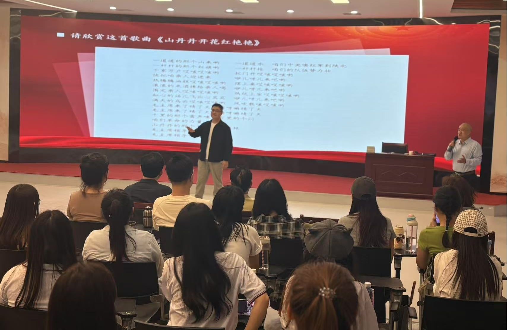 张平的党史学习教育讲座别开生面,以大量不同历史时期耳熟能详的经典红色歌曲为线索,配合生动讲述党史上和中国革命历程中一个个打动人心的革命故事,从牢记中国共产党的性质宗旨、弘扬伟大建党精神、永远跟党走、把学习贯彻习近平新时代中国特色社会主义思想不断引向深入等方面,让党的历史进程在歌声中愈发清晰,把党的百年历程和伟大精神深深地烙印在每一位师生的心中。张平深情演唱《三大纪律八项注意》《山丹丹开花红艳艳》《红日》和《我的祖国》等脍炙人口的歌曲,与李金兰和徐丽兰两位老师共同演唱了《映山红》和《毛主席的话儿记心上》,陈展昭老师现场担任指挥,大家仿佛回到了那个峥嵘岁月,深刻感受到了中国共产党领导下的革命精神和奋斗历程。讲座现场师生互动频繁,气氛热烈。