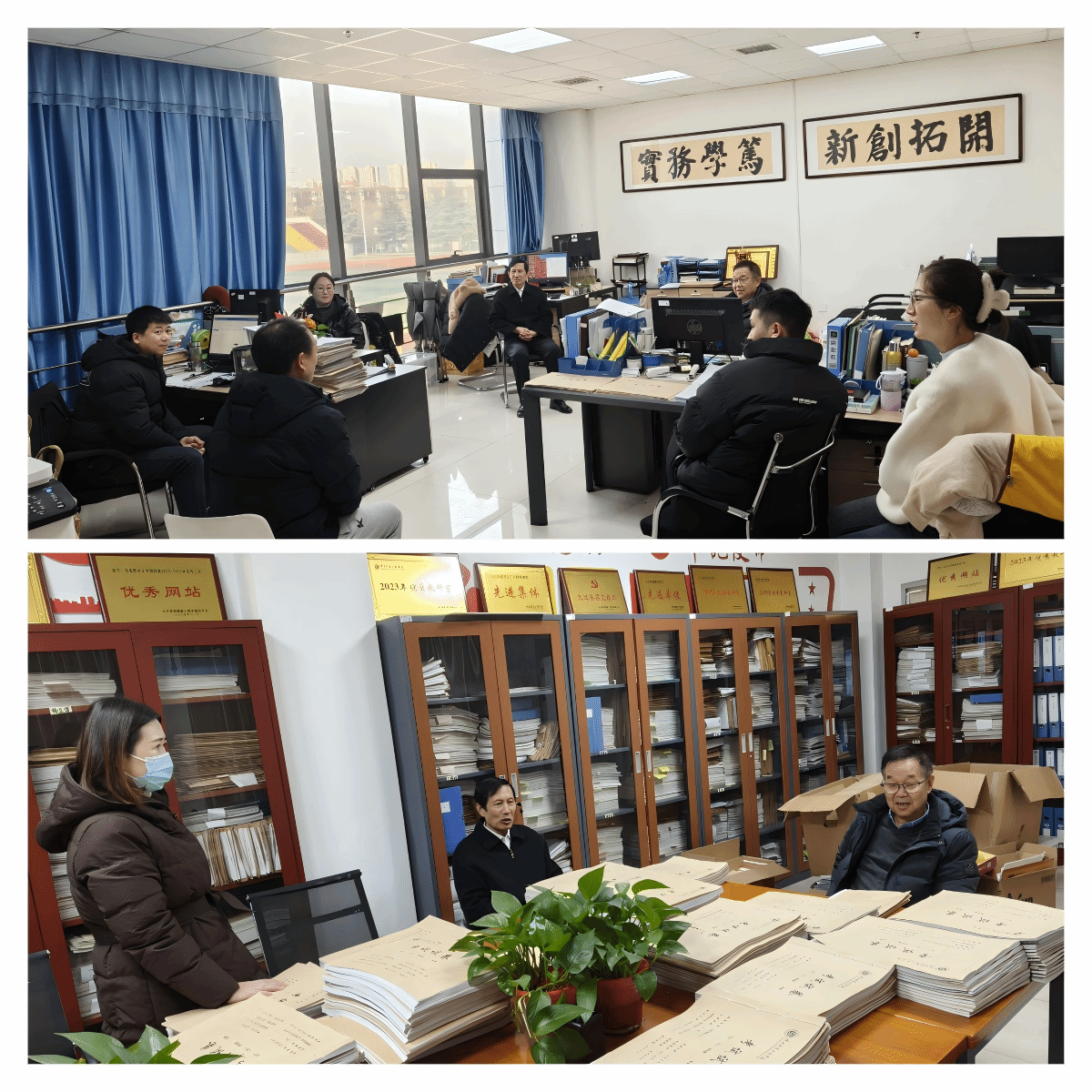 陕服新闻网讯(文迪)1月16日,校长姜寿山、副校长潘庆才先后走访教育学院、信息工程学院、马克思主义学院、健康学院、应用技术学院、艺术设计学院、服装学院和体育部等,听取教学单位关于2025年年度考核的建议,检查学期末收尾工作。